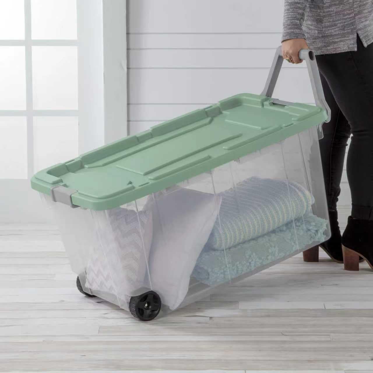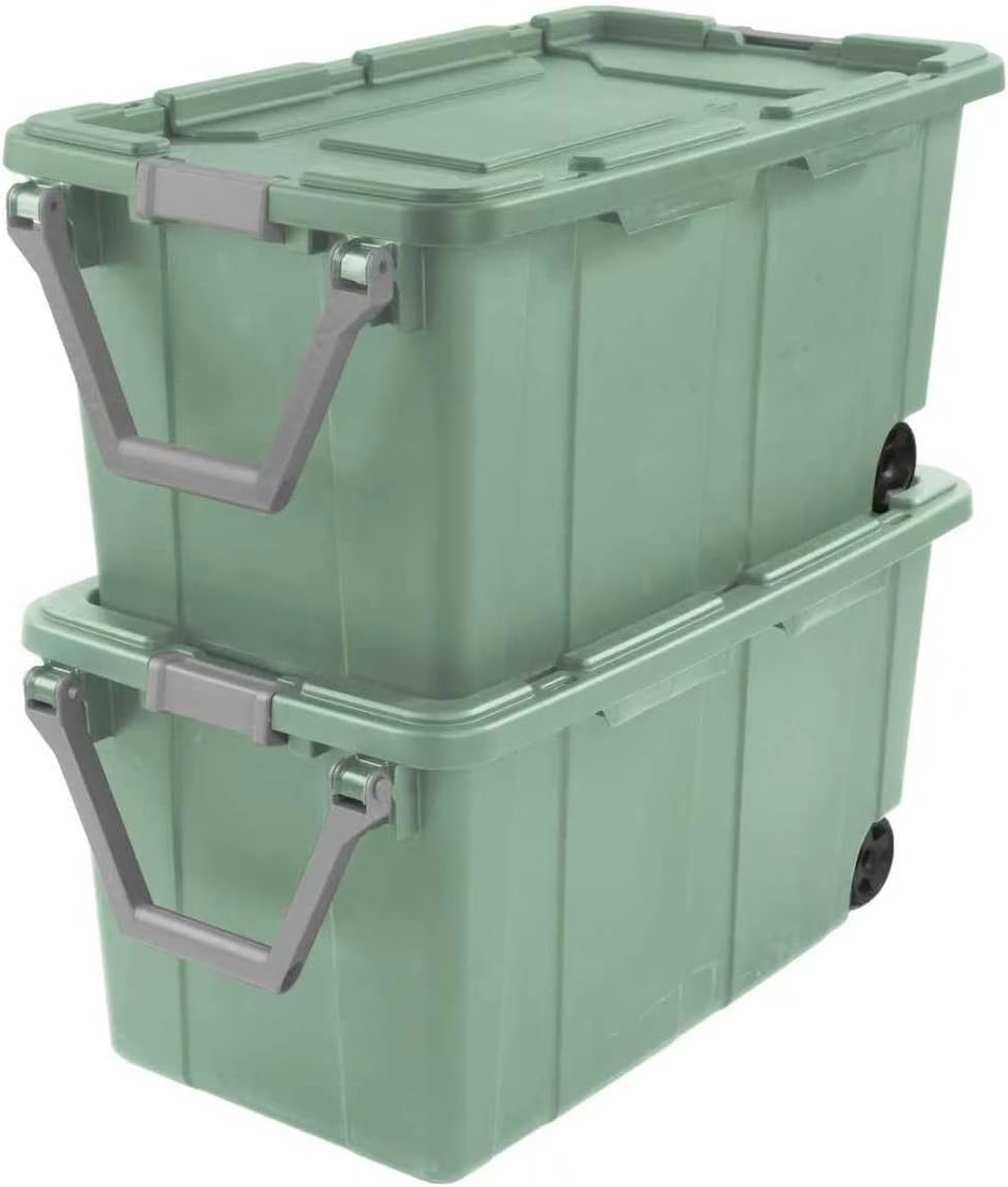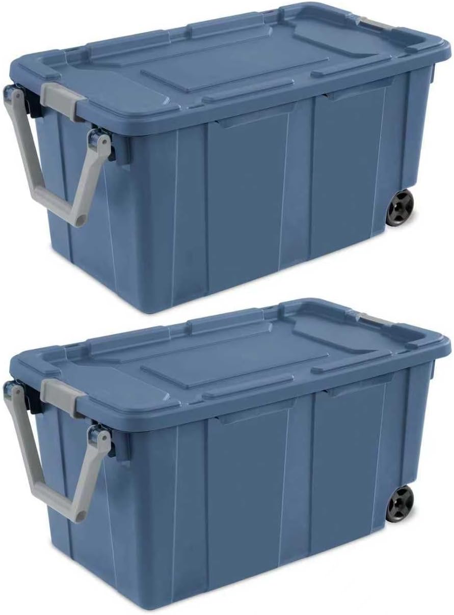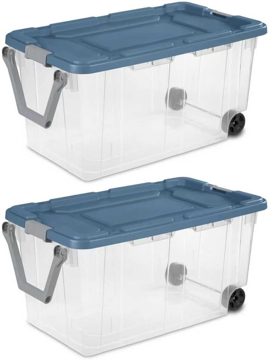 With 160 Quart Clear Wheeled Storage Bin, be confident that stored items will stay protected, even on the go! The ergonomic handle, large wheels and metal axle provide effortless transport. The innovative drip-resistant lid keeps items dry, while the grooved design allows for secure tie-downs. Rugged latches provide a sure grip and keep lid secure, while stable stacking is provided by the deep recessed lid surface. This durable plastic storage container is the ideal solution for storing bulkier, heavier supplies or multiple items in one place. Let the extra-large capacity, durable design and portability help bring order to garages, basements and more! Outside Dimensions: 36 3/4" x 21 3/8" x 18" Interior Dimensions at bottom: 26 3/8" x 16 1/2" x 17 1/4" Tight fit drip-resistant lid provides maximum protection against items getting wet