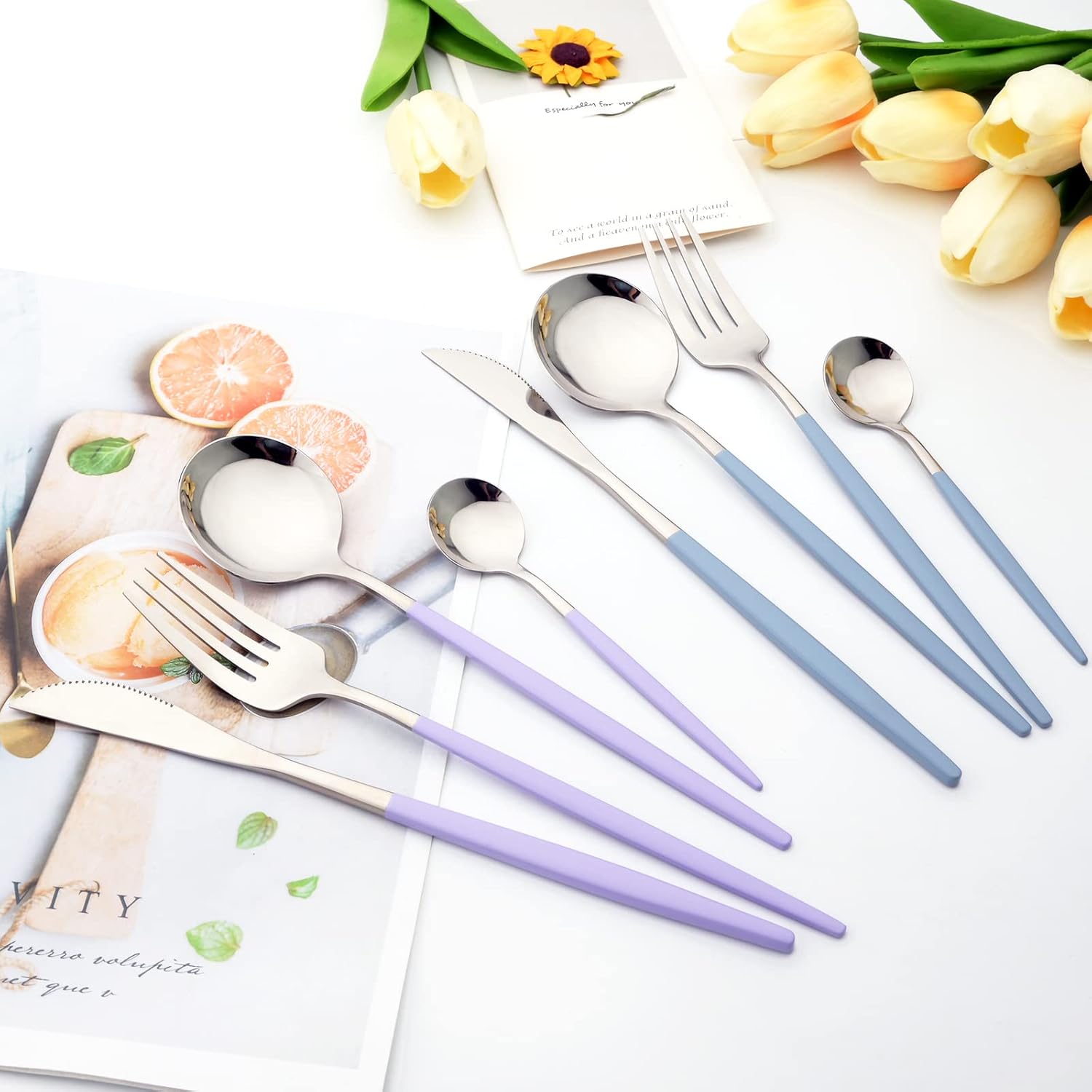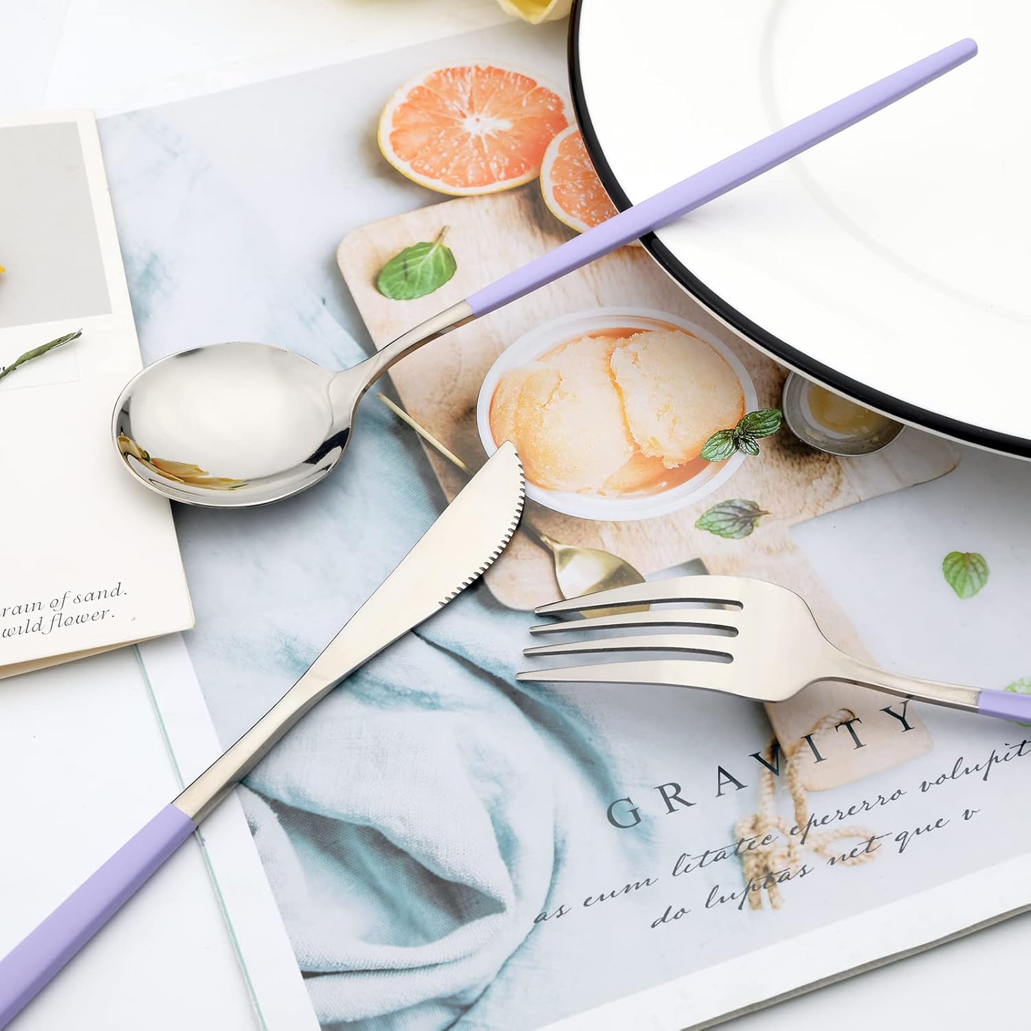 Color:Purple silver Why Choose Us? :) * Made of 18/0 Stainless Steel. * Safe: Food grade, lead free and rust free. * Dishwasher safe, easily clean up by hand-wash. * Many colors are available for you to choose. * Best Gift for Wedding Birthday Festival Housewarming product size Knife Dimensions: Length: 8.66inch Weight: 40g Dinner Spoon Dimensions: Length: 8.26inch Weight: 40g Tea Spoon Dimensions: Length: 5.11inch Weight: 10g Dinner Fork Dimensions: Length: 8.46inch Weight: 30g Using Instruction 1. Please wash the cutlery set with warm soapy water before first using to wash off any processing residue left from manufacturing. 2. Please clean and dry the flatware set after using for your healthy daily use, and store in dry place for its durability. 3. Please use soft towel to clean the set; Do not use iron wire to destroy their smooth surface. Thank you for shopping in our store. If you have any problems, please feel free to contact us. We will try our best to satisfy you. Thank you! Happy shopping!