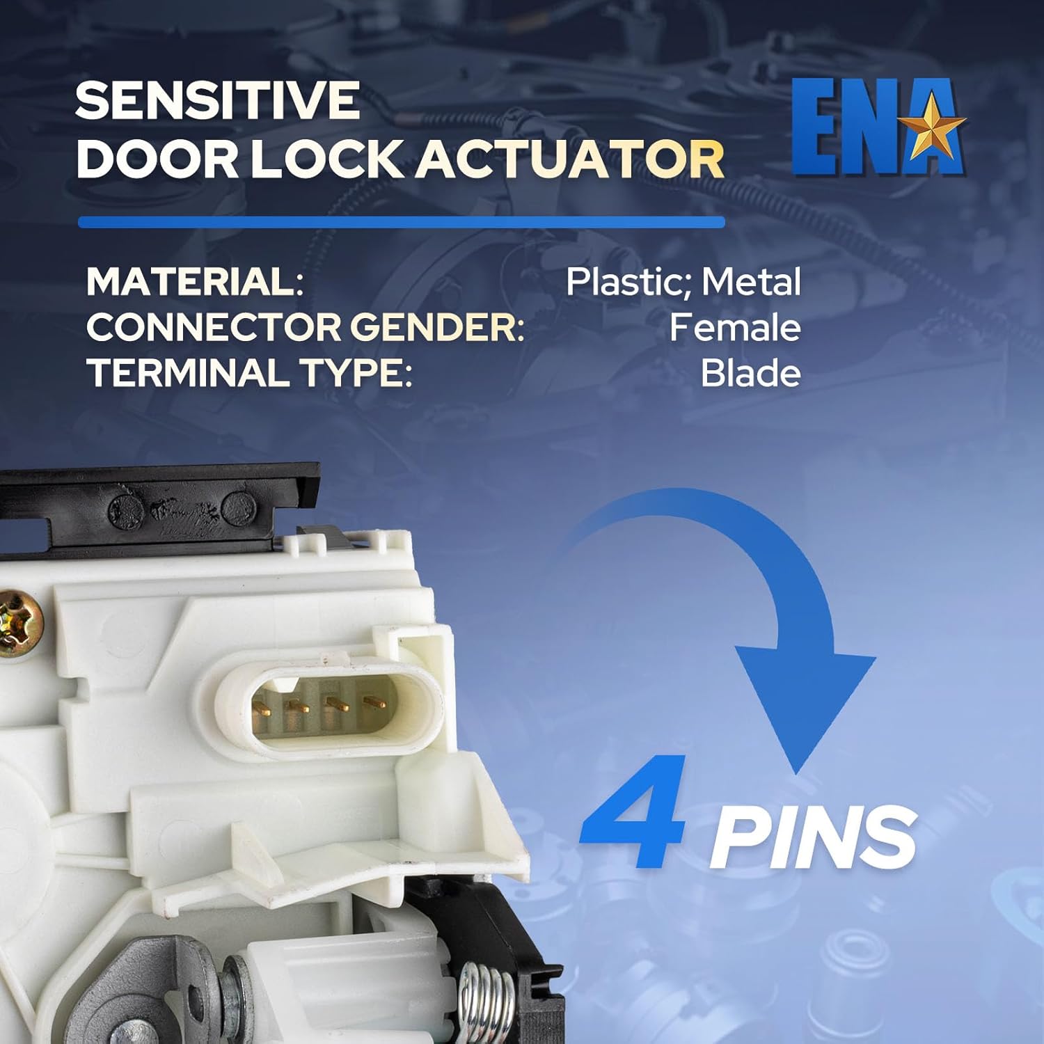 • ENA Latch Actuator Specifications: 1. Location: Front Left Driver Side; 2.Connector Gender: Female; 3. Terminal Quantity: 4; 4. Material: Plastic; Metal. The ENA Power Door Lock Actuator features durable construction with sturdy plastic and high-density metal materials for long service life, restoring proper power door lock functionality