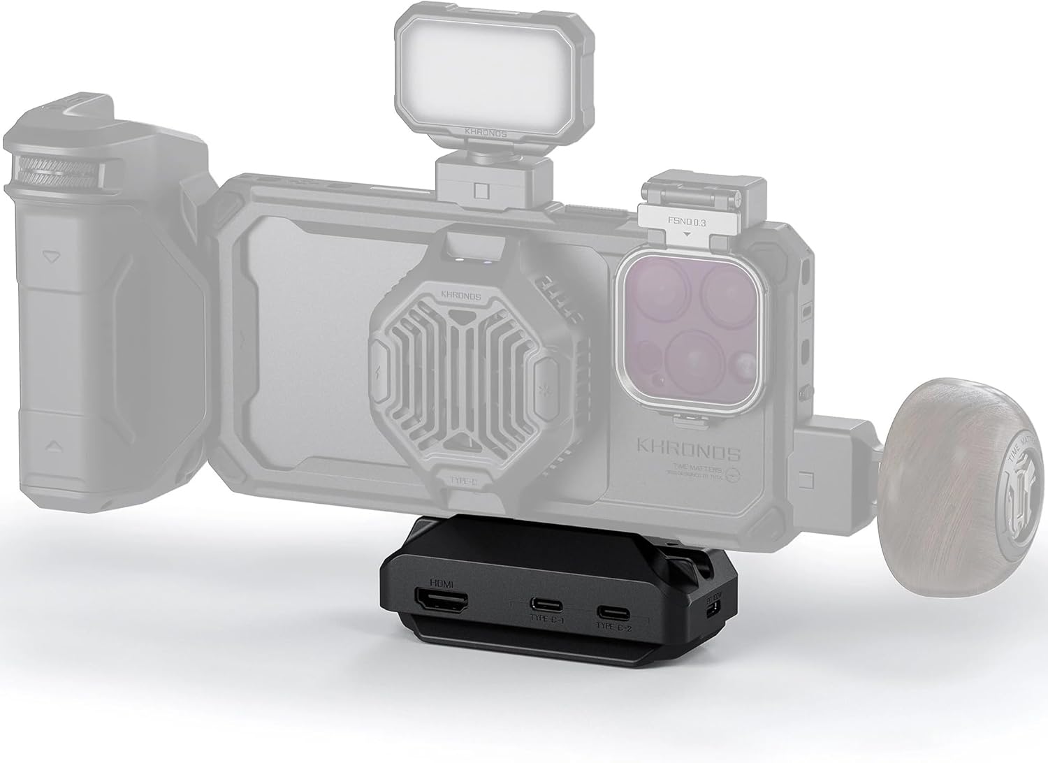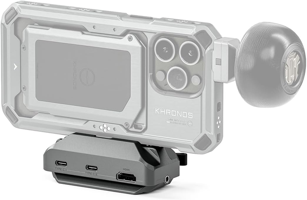 Introducing Khronos Quick Release USB-C Hub Unleash the full potential and compatible with your iPhone rig with the Khronos Quick Release USB-C Hub. This all-in-one media hub allows you to connect and compatible with your iPhone via USB-C, providing an array of expanded options for seamless integration with external devices. With 2 Type-C ports, the Khronos Hub offers unparalleled versatility. Use these ports for running power to your devices or for high-speed data transmission. Connect external SSD drives effortlessly, which is essential for recording and compatible with Apple Log and ensuring smooth, uninterrupted workflows. Both ports can be utilized simultaneously, providing unmatched convenience and efficiency. It features an HDMI port for easy video signal output to an external monitor or wireless transmitter. Experience crystal-clear video quality and streamline your live view on set. In addition to its versatile connectivity, the hub includes a 3.5 mm audio port. This allows for real-time audio monitoring when recording, ensuring precise sound capture for your projects. At the bottom of the USB-C Hub lies an integrated ARCA Quick Release Plate. This innovative design makes it ideal for mounting the Khronos Hub to tripods or gimbals with ease. Whether you’re shooting on the go or setting up for a professional production, the Quick Release Plate ensures a secure and stable connection. NOTE: The Focus Handle and USB-C Hub will require a 3.5mm TRS to 3.5mm TRRS Cable in order to use external audio sources.