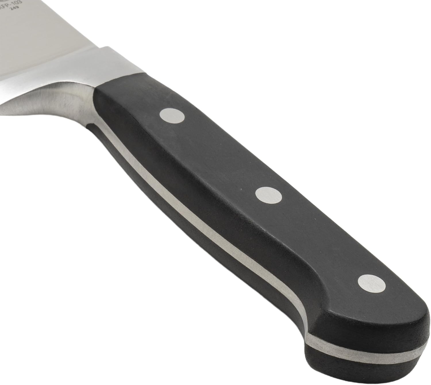 Expertly crafted for both professional kitchens and passionate home cooks, the Winco KFP-103 Acero Chef Knife features a 10-inch blade with a hollow ground edge that minimizes drag for smooth, efficient slicing. Made from forged German high carbon stainless steel, this blade promises outstanding durability, impressive corrosion resistance, and long-lasting sharpness to tackle demanding kitchen tasks with ease. Its triple riveted, full tang, one-piece construction delivers excellent balance and strength, providing precise control even during heavy use. A comfortable, wear-resistant black POM handle is injection molded for a secure grip, ensuring comfort through long hours of prep. NSF certification underscores its adherence to rigorous safety and sanitation standards, making this chef knife a reliable and sophisticated choice for any culinary setting.