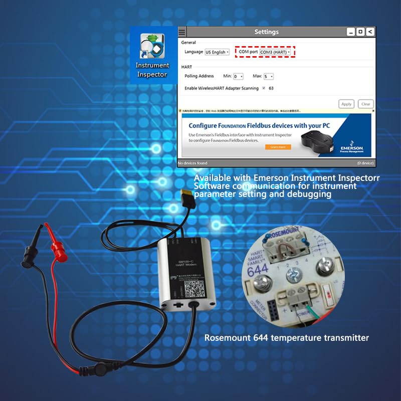 1. Product IntroductionThe SM100 - C is a HART intelligent communicator designed by JIAXING SONGMAO and complied with the industrial standard. It communicates with any manufacturer of HART instruments, such as Rosemount, E + H, For Siemens, Cologne, Yokogawa, SIC etc. The appearance is complied with integrated design, enabling to install and carry portably. The communicator is compatible with a standard USB interface and serial bus power supply to make sure the convenience and quickness.Since the SM100 - C intelligent communicator is specially designed for industrial product integration, its design specialized in the temperature range, vibration, electromagnetic compatibility and interface diversity etc.. The SM100 - C make sures the stable and high efficient operation in the bad environment and makes it ideal for with the device.2.Product Specifications: Supports Operation System Windows XP, Windows7, Windows10 Compatible with USB V1.1, USB CDC V1.1 Standard Compatible with USB V2.0, USB CDC V2.0 Standard USB Bus Power Supply Uninsulated Cables , DC 5V DC 30mA Standard HART Protocol Transmission Transparent Data Transfer Compatible with HART Protocol3. Product Features Built-In Isolated DC 24V Output. Provide Power Supply and Communication to Two-Wire Channel Instrument, to Maximize the Reduction of Wiring. HART Signal Transfer with Isolation Transformer Built-In High Precision 250 Resistance. No need to add resistance if communication test. Provides Switch to Transfer with WIFI Connection LED Panel to Monitor the Operation Status4.Product communication applicationApplication diagram of SM100-C(III) communication with the Rosemount 5400 radar level gaugeCommunication diagram of SM100-C(III) and E+H flowmetersCommunication diagram of SM100-C(III) and EJA differential pressure feederCommunication applicat