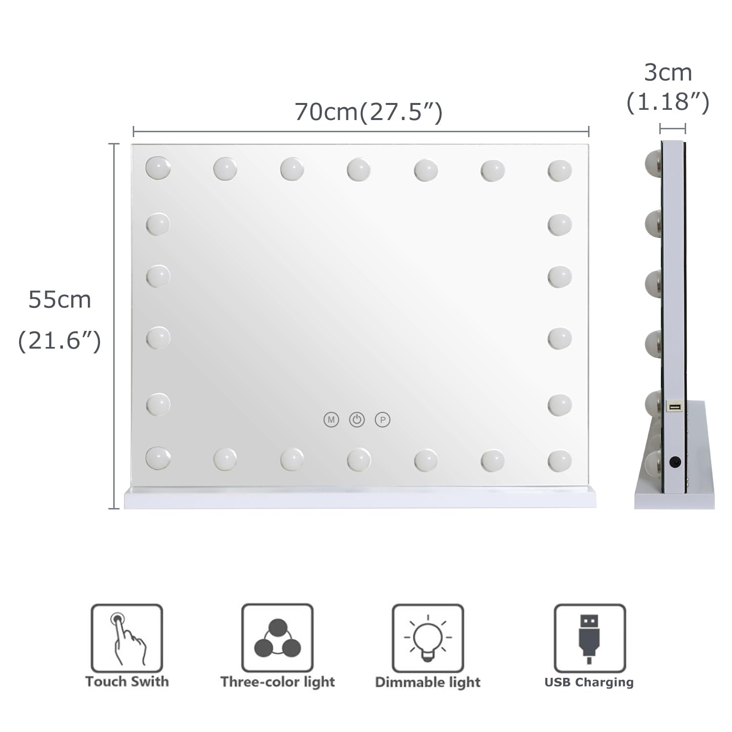 Large Hollywood Vanity Mirror, Vanity Mirror with 10x Lens, Dimmble Led Bulb, 3 Color Light Modes. Dream Vanity Mirror:The Hollywood vanity mirror is a must-have professional makeup aid for celebrities and makeup artists, and can also be installed at home. The frame of the makeup vanity mirror is made of high-quality tinplate, and the ivory white color is more stable and elegant. The vanity mirror allows you to complete your perfect makeup while enjoying the song, giving you a star-like feel and the vanity of your dreams. The Hollywood Vanity Mirror features adjustable brightness and 3 light colors (Cool White,Warm White,Warm Yellow) to help you create a flawless professional look. Product Information: Product Name:10x Lens Vanity Mirror Frame: Tinplate Mirror Color: White Hanging:Support Light:Cool White/ Warm White / Warm Yellow Bulb: 22*3W LED dimmable bulbs Mirror Size: 70*55cm Base:Detachable base Product Weight: 16Pounds Wall Mounted or Tabletop Large hollywood vanity makeup mirror is also space saver for your dressing table.It with two back hole for nail,can easily hang on the wall! Dimmable LED light bulbs Large hollywood vanity makeup mirror is dimmable light bulbs save power, Beautiful and Durable,and last up to 50,000 hours.The bulbs temperature is safe and not hot.It also remains stable over long periods of use.Protect you and your eyes. USB Chargering Port Large hollywood vanity makeup mirror is power outlet with USB port is designed on the side of vanity mirror.It is convenient to charge your mobile phone or other USB device while making up. 10x Lens Function Large hollywood vanity makeup mirror is exquisite makeup is one of the necessary conditions for a happy life every day. Hollywood make-up mirror is equipped with 10x Lens, making you a perfect makeup!