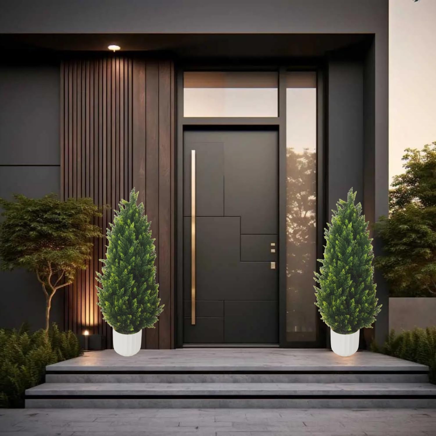 This product is a set of two 90cm artificial topiary trees, featuring lush, dense green foliage with a realistic texture and natural layering. Each tree is potted in a stylish white textured pot, offering an elegant and modern aesthetic. Made from high-quality, durable materials, these trees require no maintenance—no watering, pruning, or special lighting—making them a perfect long-lasting decorative solution. Ideal for enhancing indoor spaces like living rooms, offices, hotel lobbies, or commercial settings such as cafes, while complementing minimalist, Scandinavian, or neutral decor styles.
