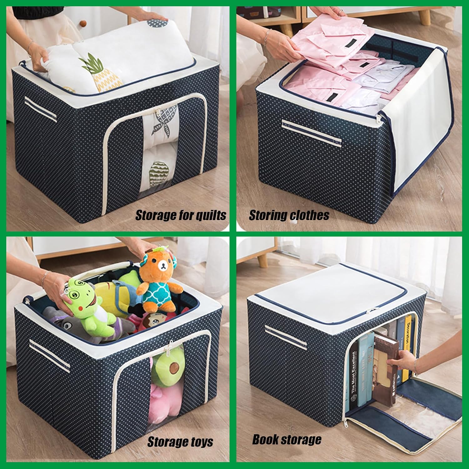 This storage bag is made of high quality oxford fabric and steel frame structure, soft and sturdy, the internal steel frame always supports the storage bag to make it long time use without deformation. It provides plenty of space for your sheets, quilts, blankets, pillows, toys, coats or other clothes. You can also take it with you on out-of-town trips and camping trips for easy storage of items. FEATURES: 1. Large enough space 2. Soft material 3. Reinforced handle 4. Foldable and easy to carry 5. Excellent waterproof performance 6. Steel frame structure-strong load-bearing capacity 7.Large viewing window SPECIFICATIONS: Product name: storage bag Color: navy / pink / red / coffee Size: 15.7*11.8*7.8inch 19.6*15.7*12.9inch Packing: 1*storage bag If you have any questions, please feel free to contact us, we will reply you immediately within 24 hours