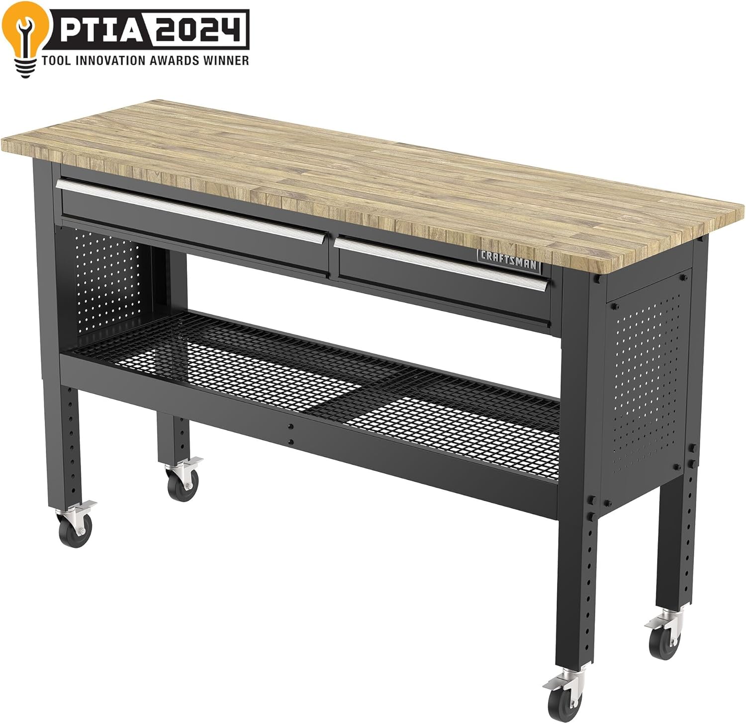 Take pride in your workspace and keep your tools organized using the CRAFTSMAN 6 ft., 2-Drawer Adjustable Height Workbench. Featuring a solid butcher block top for a sturdy work surface, this durable workbench was designed with a 2,000 lb. load rating when the included leveling feet are installed. Tailor your workbench to accommodate your needs using the adjustable height feature. With internal and external storage options, integrated charging capabilities, and included casters for mobility, this workbench is a functional storage solution for your shop or garage.