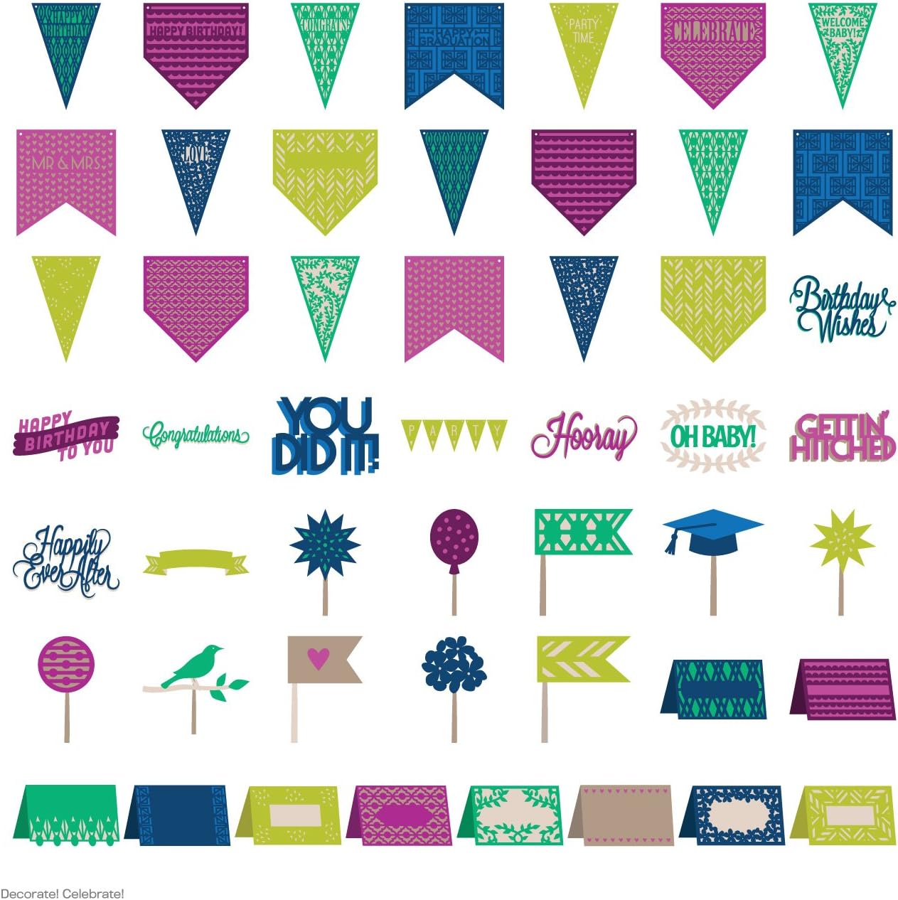 Throw a party in style! Layered banners, cake toppers, phrases and cards celebrate congratulatory occasions such as birthdays, baby showers, weddings, graduations and more.
