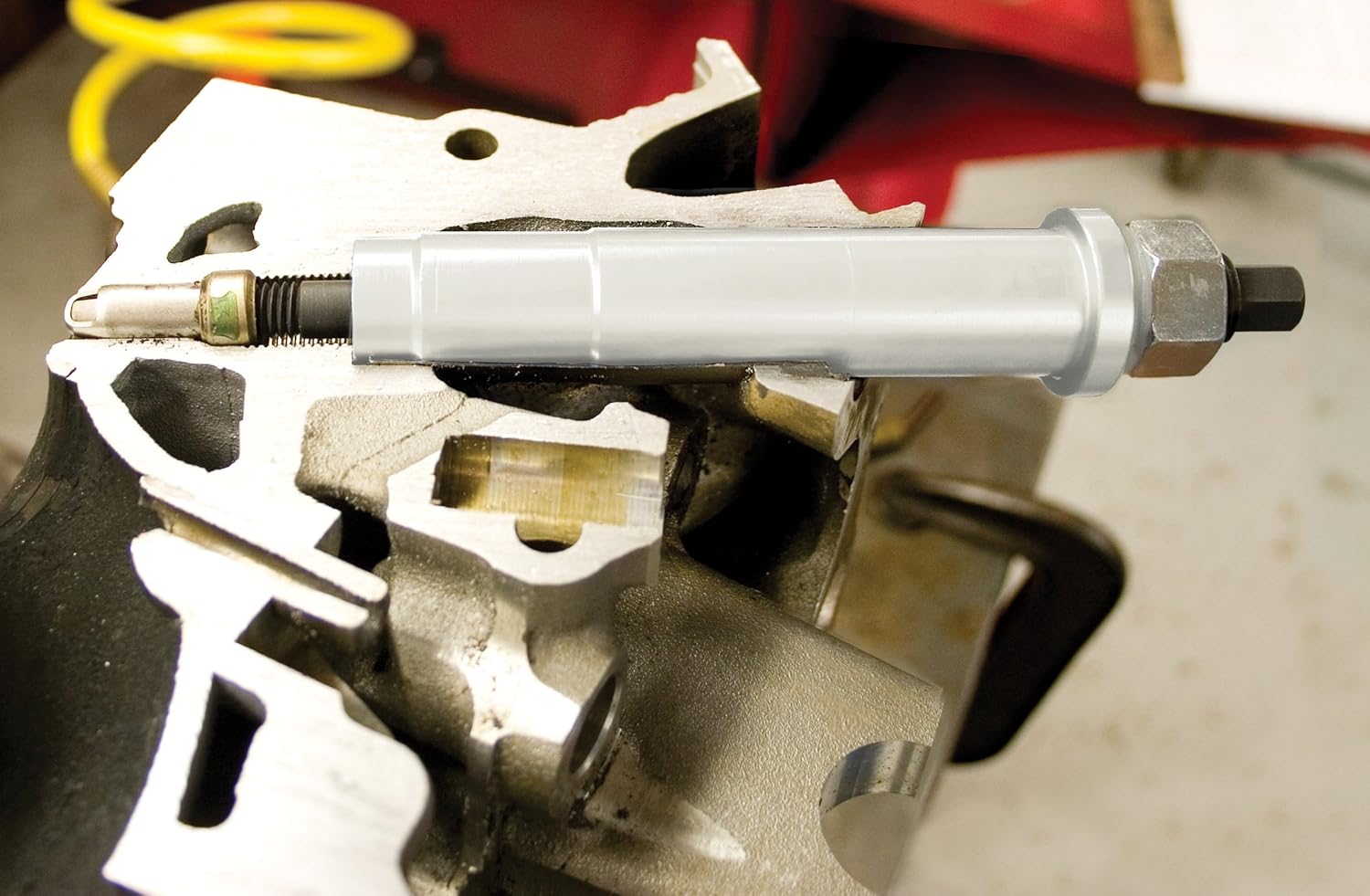 This tool set removes broken spark plugs from 2004 and newer Triton 3 valve per cylinder engines, (a common problem). The set includes a unique porcelain pusher tool and a tapered left-hand thread remover for removing the broken spark plug without leaving the porcelain in the engine cylinder. Porcelain pusher is used to press the porcelain piece, without breaking the porcelain, farther into the plug tip. This provides space for the left hand thread remover to bite into the stainless steel plug tip so it can then be pulled. Blow-molded storage case included.