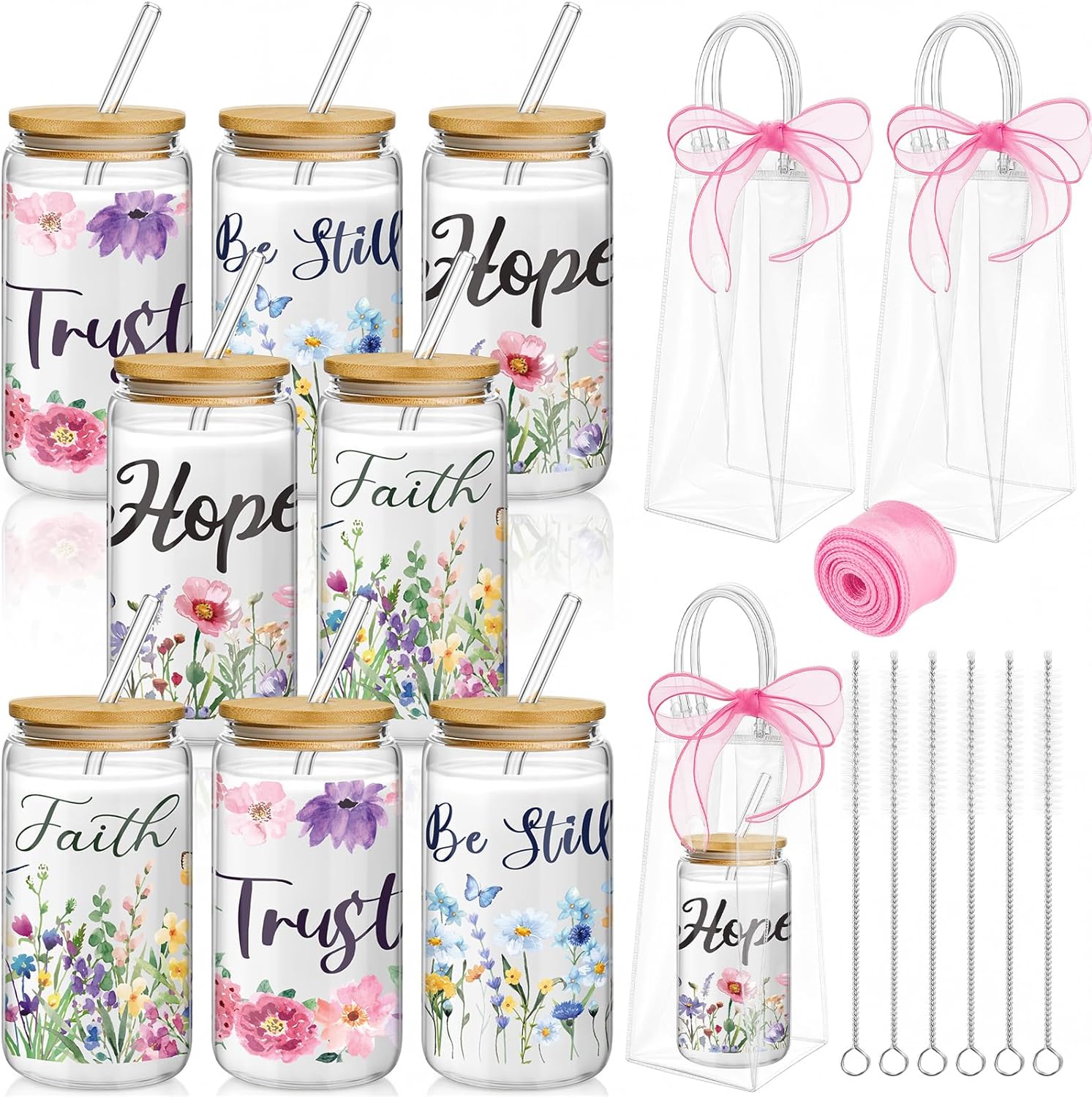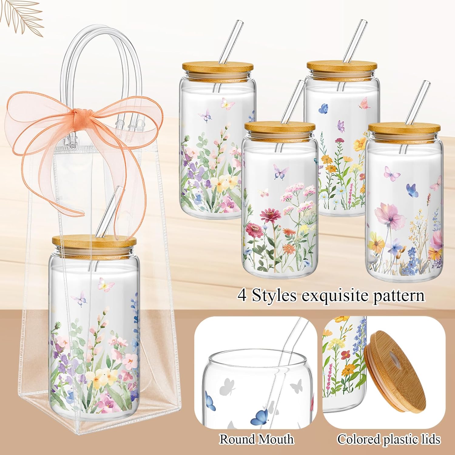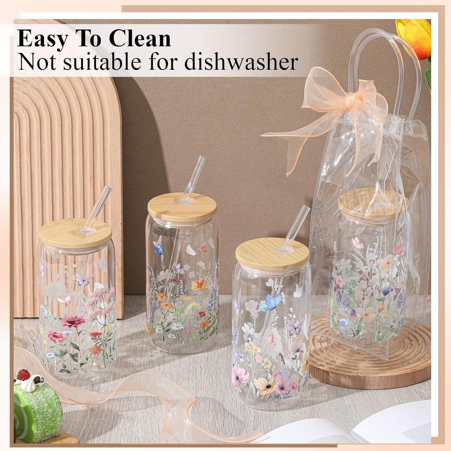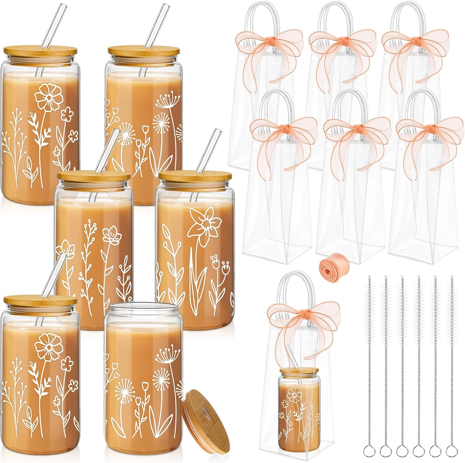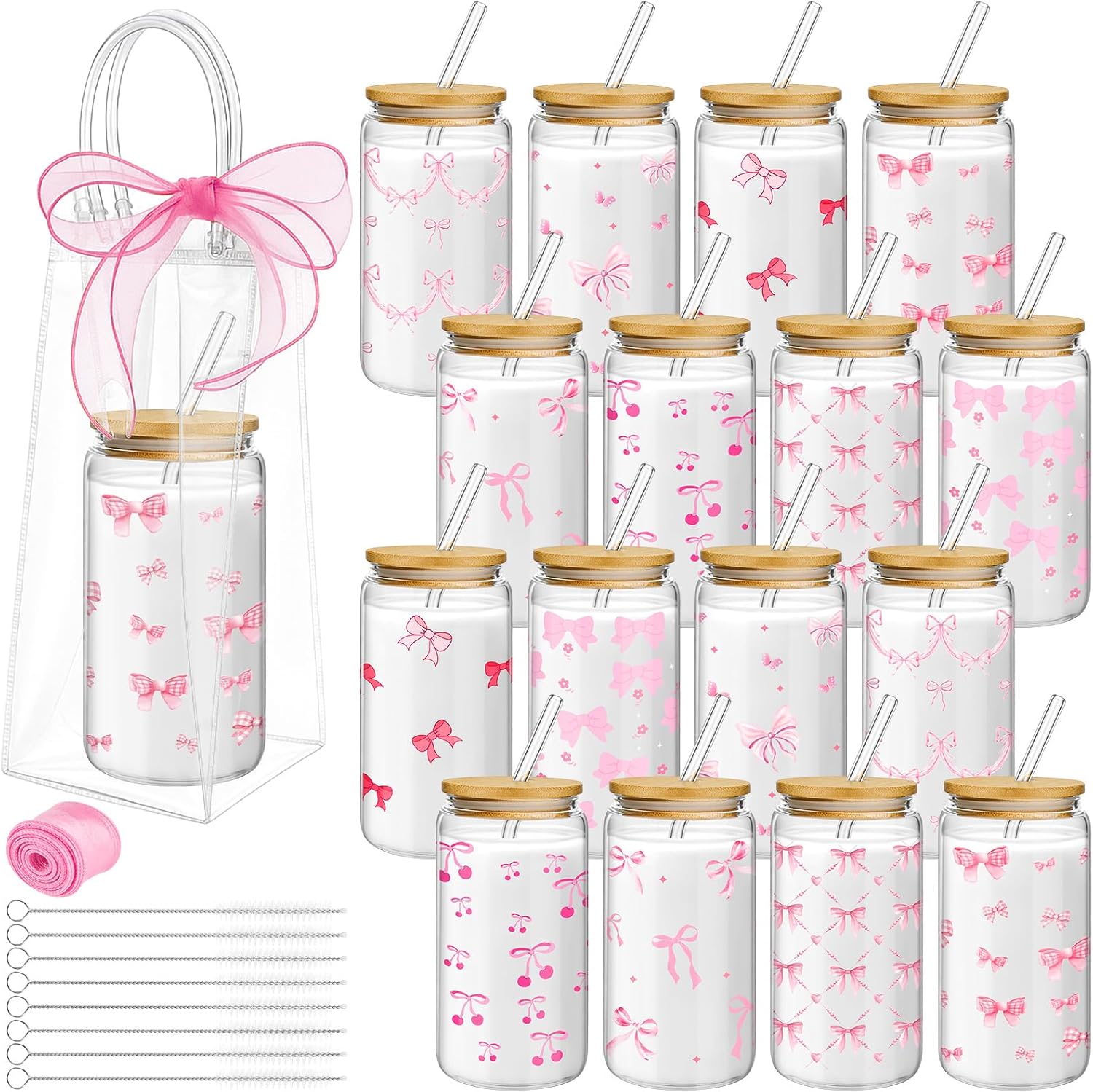 Features: Multifunctional Glass: This coquette bow glass is suitable for your favorite cold drinks, such as iced coffee, iced beer, cocktails, tea, soda, water, smoothies, juice or other fun holiday drinks Easy to carry: Our bow knot silicone straw cover can be fixed on the glass straw to effectively prevent dust and splash. And after opening the lid, it can still be hung on the side of the glass straw to prevent loss Specifications: Material: glass Color: multicolor, clear Size: about 5.88 X 3.08 inches/16 oz Package includes: 6 X wildflower cups glass 6 X Straw 6 X Clear gift bags 1 X Pink organza ribbon Notes: Manual measurement, please allow slight errors on size. The color may exist a slight difference due to different screen displays.