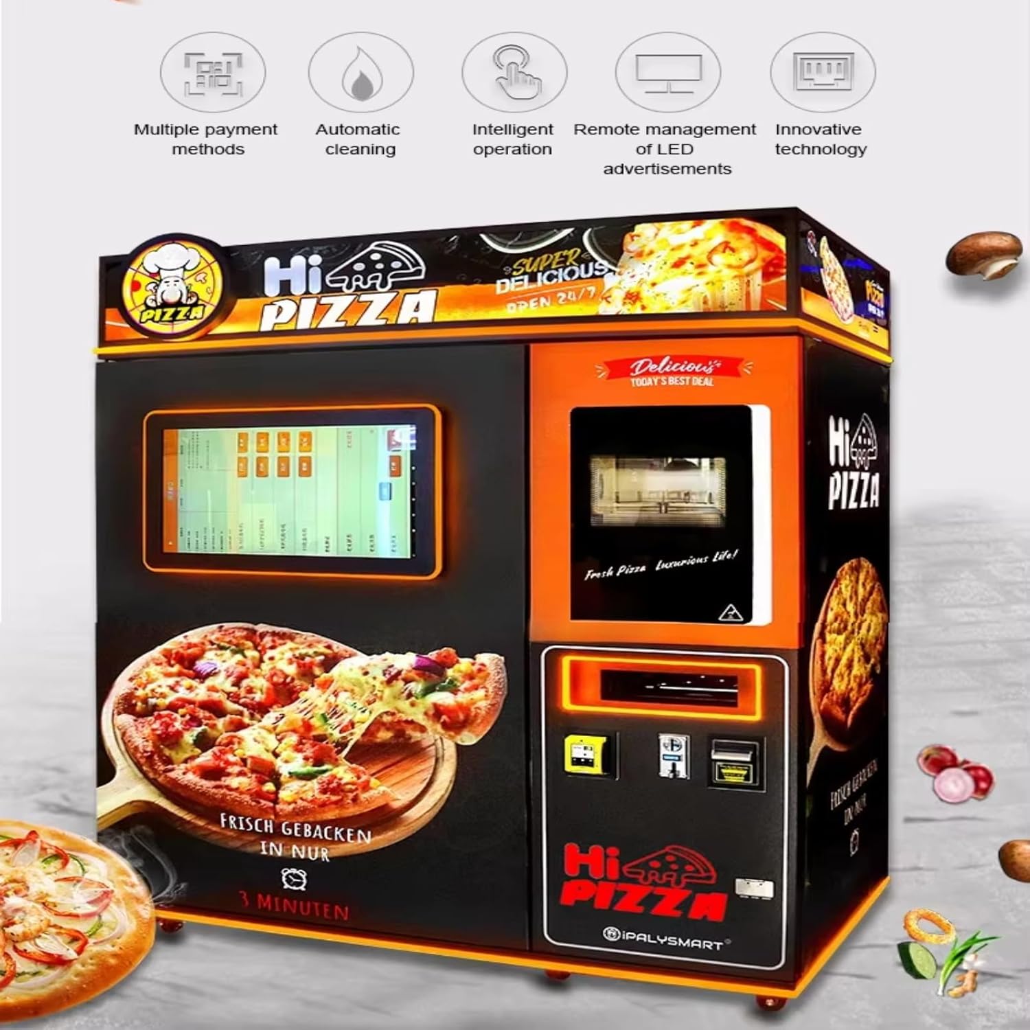 Combining smart technology with efficient performance, this commercial pizza vending machine integrates ordering, baking, and dispensing into one seamless process, making it the perfect solution for modern unattended retail. Features: advanced touchscreen interface, high-speed heating oven internal refrigeration system supporting continuous 24/7 operation. high-capacity storage integrated cashless payment vending machine technology Specifications: Capacity: Customizable With Heatsink: Yes Dimensions: Customizable Type: Vending Machine Warranty: 1 Year Function: SDK Keywords: Fully Automatic Pizza Vending Machine Material: Metal + Acrylic + Plastic Application: Hotels, Subways, Shopping Malls Color: Customizable Colors Payment System: Banknotes, Coins, Tokens, Card Payment Screen: 27-inch/55-inch After-Sales Service: 24-hour Support, Video Technical Support Power: 6800 Watts Payment Methods: Banknotes + Coins + Change + QR Code (Optional) This self service pizza machine is ideal for high-traffic locations such as shopping malls, airports, universities, office buildings, and hospitals. As a 24/7 food vending machine, it operates without staff, reducing labor costs and creating a reliable source of passive income for business owners and entrepreneurs.