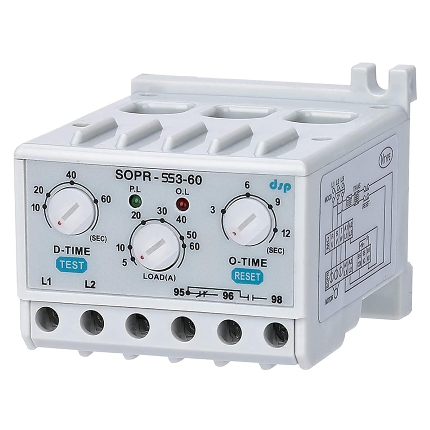 relayFeaturesSuper SmallOver-Current Circuit Breaker Lock ProtectionSeparate Set-up for each Operation Delay / Operation Delay TimeWide Range of Set-upWide Operating Voltage RangeOperation Indicator and Identification of Actual Current(LED)Manual / Electric ResetAmbient InsensitiveLow Energy Consumption(No Volt Release/Fail-safe Operation)N TypeSingle-phase, three-phase available (No Volt Release/Fail-safe Operation)NUsed for- Low Voltage Induced Electromotor (600V Level) Protective Relay- Break-Down Watch Current Relay- Alternative Replacement for the Existing RelayProtetcionProtective Item Operating (Trip) TimeOver-Current = O-TIMEPhase Loss = O-TIMELocked Rotor = D-TIME+O-TIMELEDAmmeter Function:After the motor runs smoothly, turn the overcurrent setting knob slowly counter clockwise to the red indicator light, which is of the actual running current. And then turn the knob clockwise to just turn off the red light at this point for the actual running current value of about 103%. Run / Operation Indicator:Relay Trip: Red LEDPower / normal operating status: Green LEDManual / Electric ResetWith test button held down,the red LED is on and the product will trip after O-TIME.The relay will be de-energized when RESET button is pushed or the control power is disconnected.SetAfter the installation is complete the as follows.Set knob: D-TIME(Delay Time) Set two to three seconds longer than the motor starting time.Set knob: O-TIME(Over-current run time) Set less than the motor's endurance time with over-current.Set knob: Load(Rated Current) Set over 110% of the motor's rated current of under 120% of its operating current.TEST InstructionWith test button ehld down,the red LED is on and the product will trip after O-TIME.The relay will be de-energized when RESET button is pushed or the