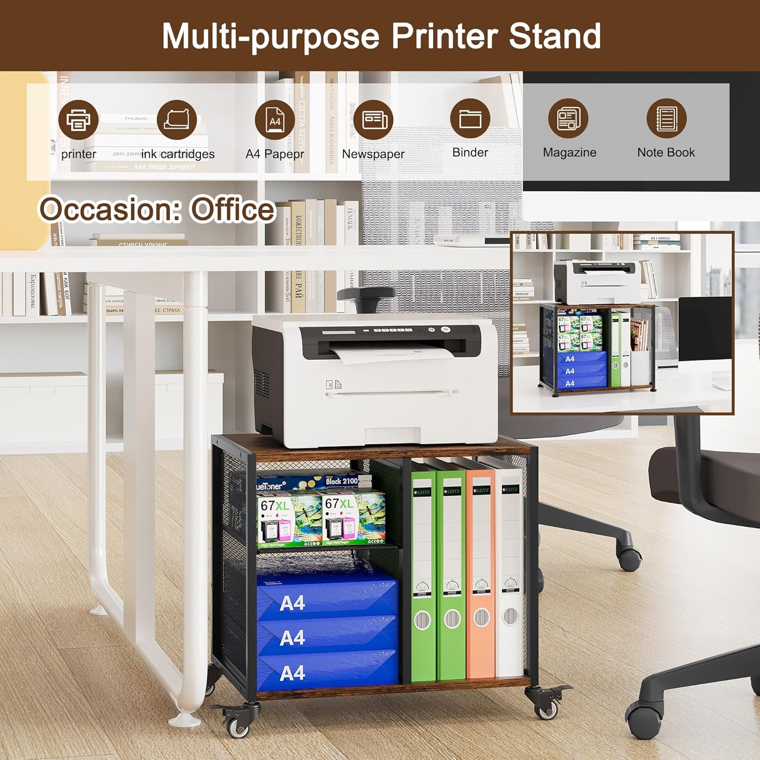 • Double-Layer Storage System: The innovative two-layer storage structure allows the printer to be placed on the top layer, while the bottom layer can store paper, ink cartridges, and other consumables. The large storage space on the right side makes it convenient to access frequently used documents. The metal frame has been treated for rust prevention, ensuring durability without rusting. Especially suitable for offices or home workspaces with limited space, allowing every inch of space to be fully utilized and keeping the work environment organized