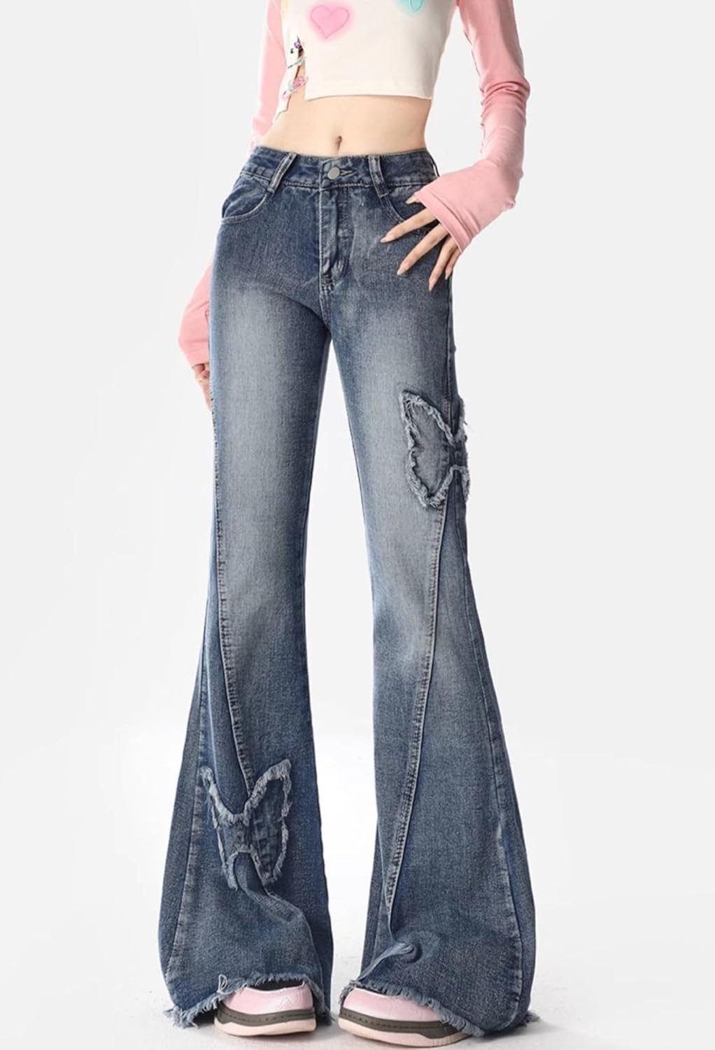 [Product Name] Women's butterfly embroidered raw edge flared jeans, loose and casual[Product Information]Material: cotton, polyesterPants length: long pantsThickness: moderateStyle: flared pantsWaist type: high waistColor: blueSize: S, M, L, XL,2XL, 3XL[Packaging] Women's flared pants × 1
